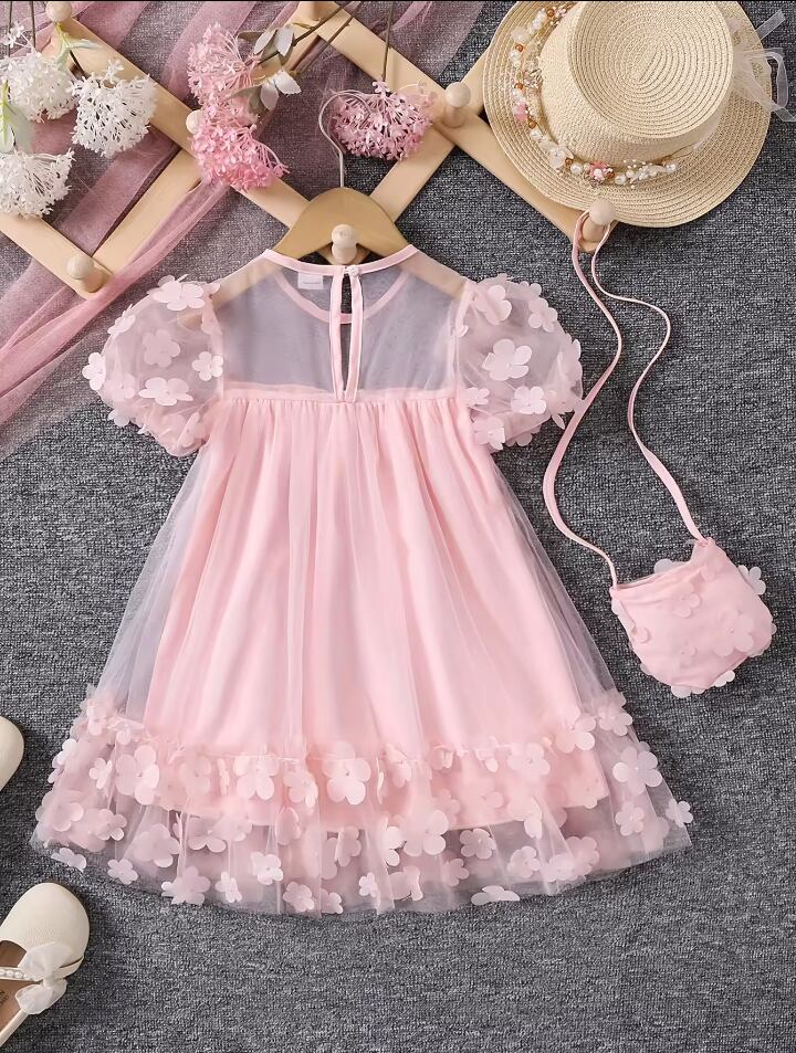 このドレスは、軽やかなメッシュスプライスデザインが特徴で、ピンクの色合いが魅力を引き立てます。誕生日パーティーや発表会など、フォーマルなシーンにもセンス良く着こなせるアイテムです。花のディテールとメッシュの組み合わせが、お子様をまるでプリンセスのように美しく演出します。ぜひ、このドレスで思い出に残る特別な日を過ごしてみてください!